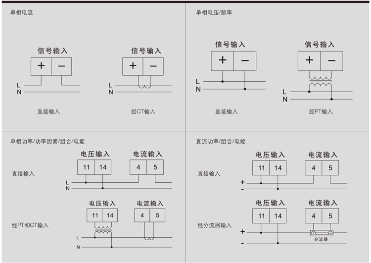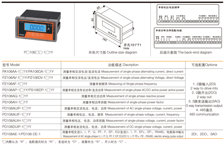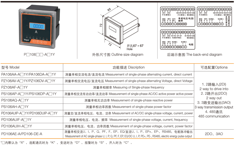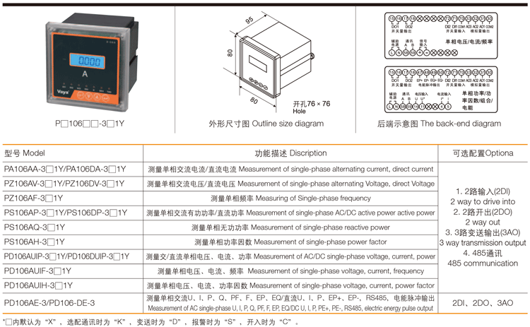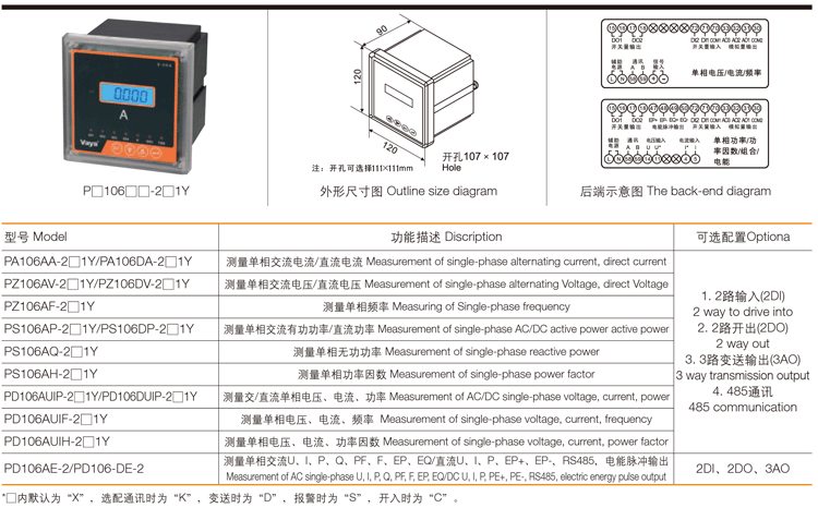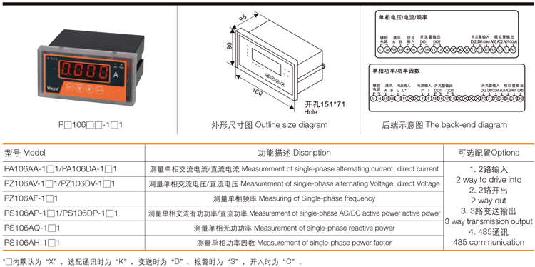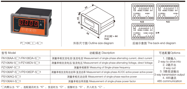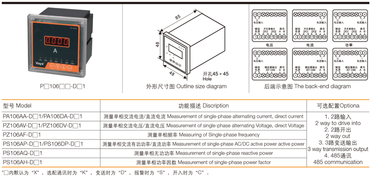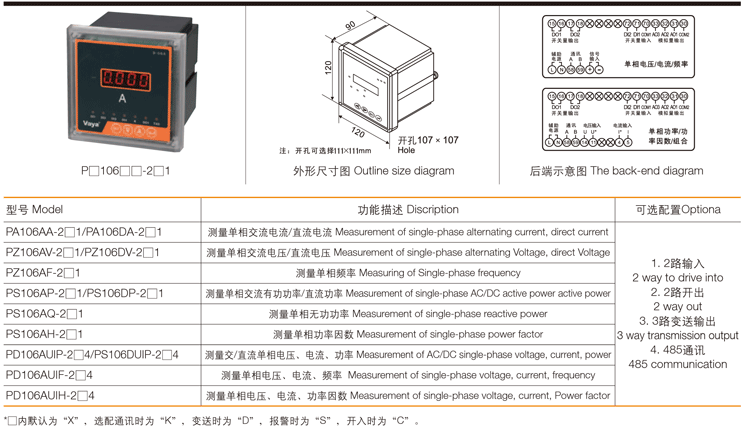 概述 单相数字电测表适用于电力电网,自动化控制系统,主要测量电网中的各种单相电参量,如电流、电压、频率、功率因数、有功功率、无功功率、电能等,按照其附加的功能划分,我们拥有X、K、D、S、C五个系列数显仪表。产品符合GB/T22264.1-2008、GB/T13978-2008。 X系列可编程电测仪表,主要是电网中对电流、电压、功率、频率、功率因素等电参量的测量和显示,变比键盘可设,具有显示直观、精度高、稳定性好、抗震动等优点,可用于波形严重畸变的场所。 K系列智能数显仪表是在X系列基础上增加了一路RS485通讯接口输出(采用Modbus-RTU协议)以方便组网的数显仪表。 D系列数显变送仪表是在X系列基础上增加了模拟量变送输出,可选0/1~10V,0/4~20mA输出。 S系列数显报警测控仪表是在X系列基础上增加了继电器输出功能(实现“上下限报警”),可任意设置报警项目,使用灵活方便。 C系列智能数显监测仪表是在X系列基础上增加了开关量输入功能,可用于监测如故障报警节点、分合闸状态、手车位置、电容补偿柜电容投入状态等。 五个系列的仪表功能可任意叠加。