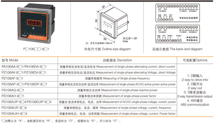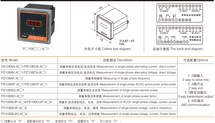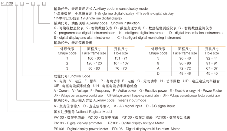 订货示例 例1: 名称:单相数显变送仪表 型号:PA106AA-9D1 电源:AC85~270V 信号输入:AC100A/5A 其它:4~20mA对应0~80A |