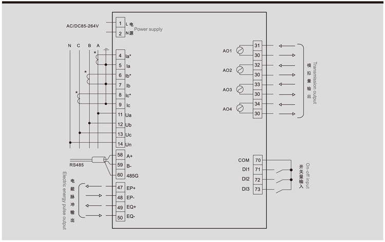 典型功能接线示意图 ◆产品只具备一路通讯接口; ◆产品扩展功能通道数少于以上示意图,则默认从第一路端号开始。