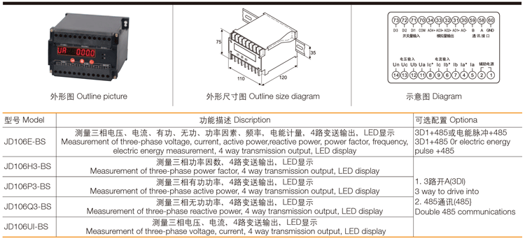 订货示例 例1: 名称:多功能变送器 型号:JD106E-BS 电源:AC85~270V 信号输入:AC220V AC100A/5A 三相四线 其它:A01,4~20mA对应A相0~80A A02,4~20mA对应B相0~80A A03,4~20mA对应C相0~80A A04, 4~20mA对应0~66KW |