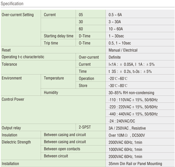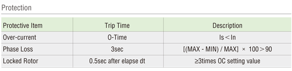 ● MCU(Micro Controller Unit) based / 2-CT Type ● Real Time Processing / Higher Precision ● Current Setting Range - 05Type : 0.5 ~ 6A / 30Type : 3 ~ 30A / 60Type : 10 ~ 60A ● Digital display : trip cause / easy troubleshooting ● Reset : Manual (instantaneous) / Electrical (remote) ● Load selection by DIP switch : Single phase(1P) / Three phase(3P) ● Fail safe(N) / Non-fail safe(R)