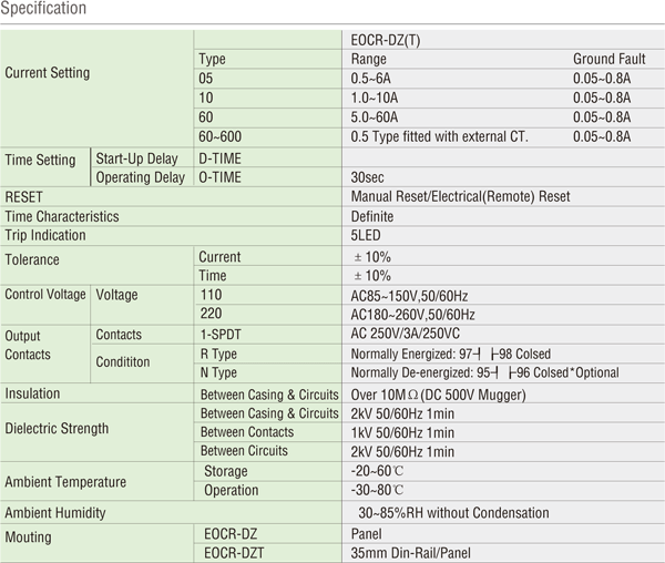 ● MCU Based ● Ground Fault/ Over-Current/Phase Loss/Phase Umbalance/Phase Reverse/Locked Rotor ● Definite Trip time characteristic ● Manual(Instantaneous)/Electrical (Remoter)Reset ● Trip Indication LED ● DZ: Window Type Terminal Type ● EOCR-DZ+Power Terminal Kit→EOCR-DZT