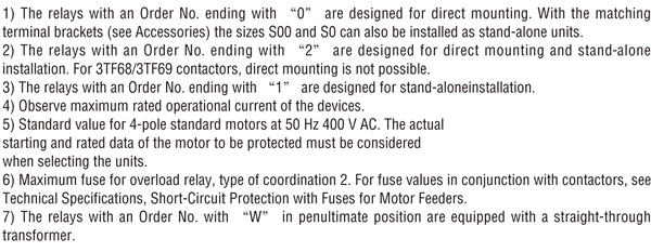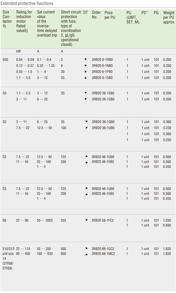 3RB20 overload relays with screw connection on auxiliary current side for direct mounting1)2) and stand-alone installation2)3), CLASS 10 Features and technical specifications: ● Overload protection, phase failure protection and unbalance protection ● Internal power supply ● Auxiliary contacts 1 NO + 1 NC ● Manual and automatic RESET ● Switch position indicator ● TEST function and self-monitoring