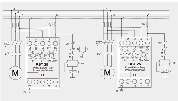 The RST 25 can be connected as following in the installation diagram: FIG1: connection of the relay before operation. When the relay is connected as in FIG 1, the there yellow LED’ sL1, L2 and L3 light up when The power supply A1 phase L, the A2 Neutral, and the three phases “L1”, “L2”and “L3”are connected. If there is no under or overvoltage, phase failure or phase sequence, the green LED lights up, (terminals 11 and 14 are closed )and the relay is ready for self retaining. It is also possible to connect the power supply after operation in FIG2. By both FIG’ s 1 and 2, the terminal “PE” must be grounded.