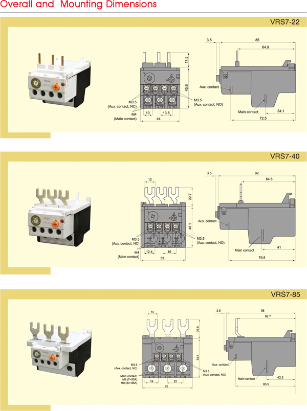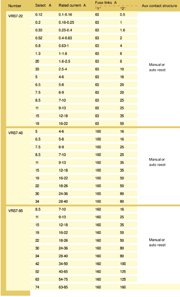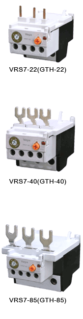 VRS7 series thermal overload relay are suitable for overload and phase-failure protection of AC motors with frequency of 50/60Hz,voltage up to 690v,current up to 0.1-85A under 8-hours duty or uninterrupted duty. Functions provided by these relays, are phase-failure protection, temperature compensation, ON/ OFF indication ,Stop button,Test button and manual/automatic reset. Applicable Standards National Standard: GB 14048 International Standard: IEC 60947-4-1 The relays can be mounted onto contactors or installed as single units.