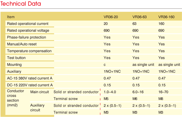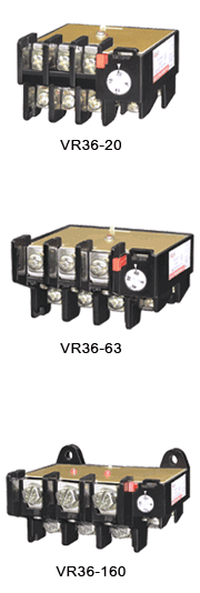 VR36 series thermal overload relay are suitable for overload and phase-failure protection of AC motors with frequency of 50/60Hz, voltage up to 690v, current up to 0.25-160A under 8-hours duty or uninterrupted duty. Functions provided by these relays, are phase-failure protection, temperature compensation, and manual/automatic reset. Applicable Standards: National Standard: GB 14048, International Standards: IEC 60947-4-1 The relays can only be installed as single units. Also can be mounted on CJT1 contactor as QC36 electromagnetism starter
