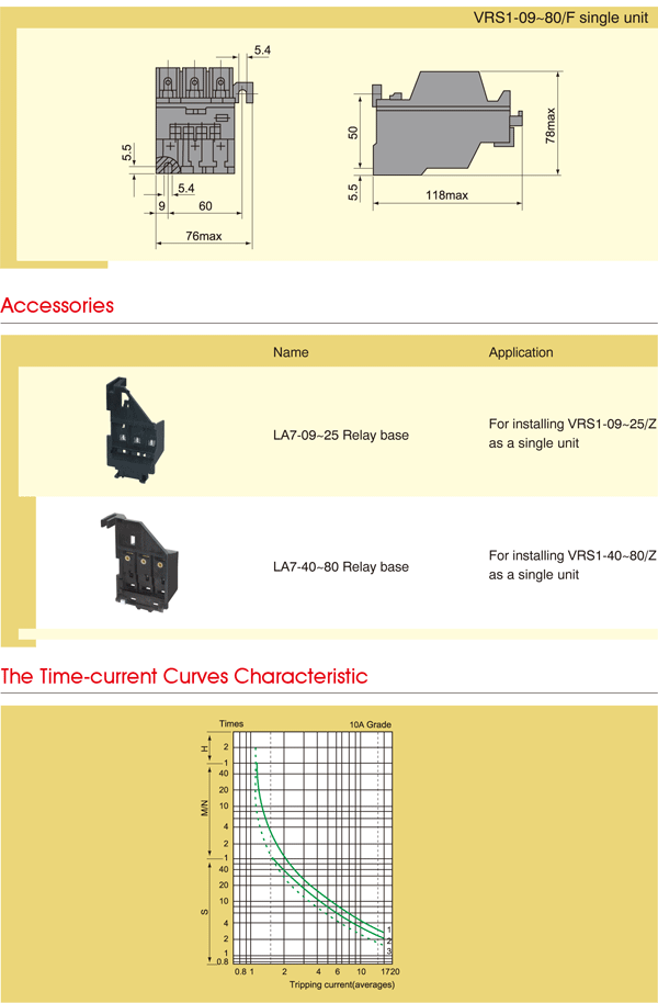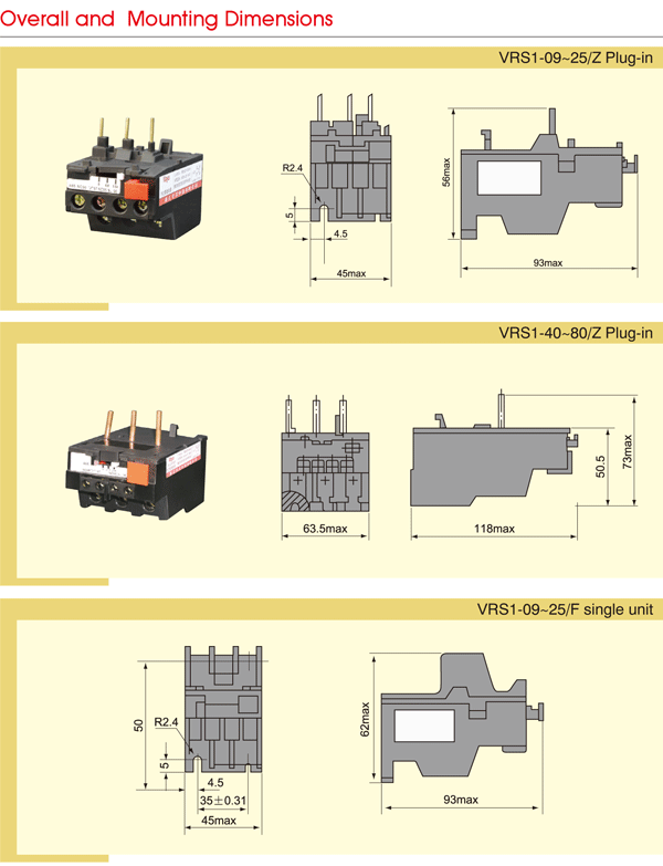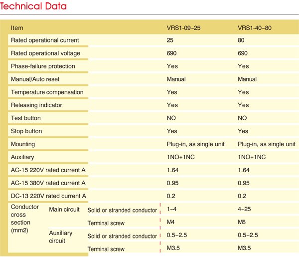 VRS1 series thermal overload relay are suitable for overload and phase-failure protection of AC motors with frequency of 50/60Hz,voltage up to 690v,current up to 0.1-80A under 8-hours duty or uninterrupted duty. Functions provided by these relays, are phase-failure protection, ON/OFF indication, temperature compensation, and manual/automatic reset. Applicable Standards: National Standard: GB 14048. International Standards: IEC 60947-4-1 The relays can be mounted onto contactors or installed as single units.