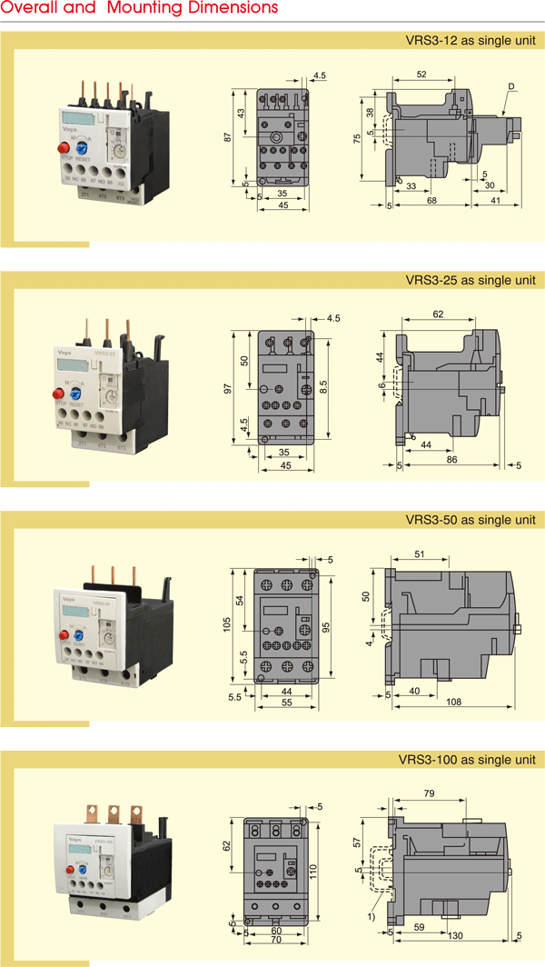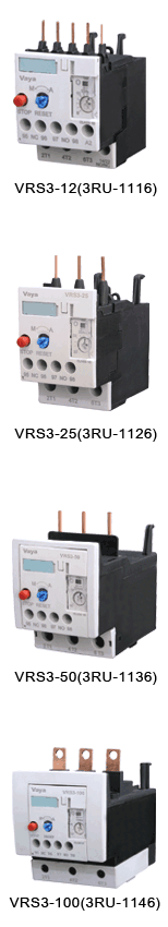 VRS3 series thermal overload relay are suitable for overload and phase-failure protection of AC motors with frequency of 50/60Hz,voltage up to 690v,current up to 0.1-100A under 8-hours duty or uninterrupted duty. Several functions provided by these relays, are phase-failure protection, temperature compensation, ON/OFF indication ,Stop button ,Test button and manual/automatic reset. Applicable Standards National Standard: GB 14048 International Standard: IEC 60947-4-1 The relays can be mounted onto contactors or installed as single units.