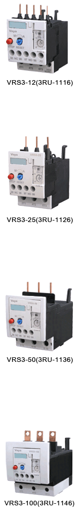 VRS3(3RU)Реле тепловой перегрузки (именуемое в дальнейшем тепловое реле) применяется переменный ток50Hz/60Hz、номинальное напряжение690V、электронный ток0.1-100A охраняющее перегрузку и перерыв фазного двигателя переменного тока во время долговременной работы или перерыв долговременной работы.