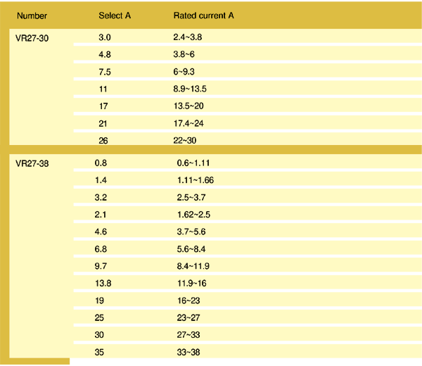 VR27 Реле тепловой перегрузки (именуемое в дальнейшем тепловое реле) применяется переменный ток50Hz/60Hz、номинальное напряжение660V、электронный ток 38A охраняющее перегрузку и перерыв фазного двигателя переменного тока во время долговременной работы или перерыв долговременной работы.